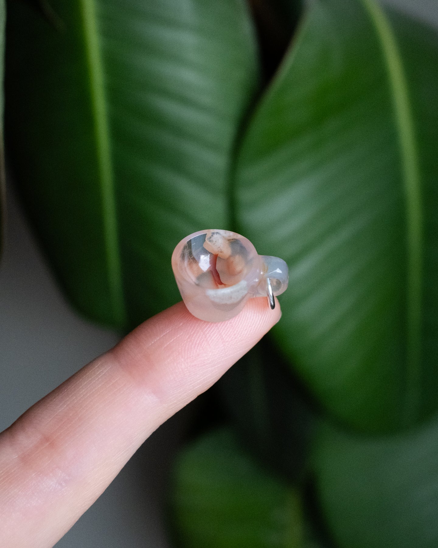 ☕️ Birthed from my love of coffee, ceramics, and jewels. This teeny tiny mug pendant is hand carved from stunning flower agate, and comes on your choice of recycled sterling silver or 9ct gold. There's a variety of chain options, so do spend a moment finding your ideal length and chain.