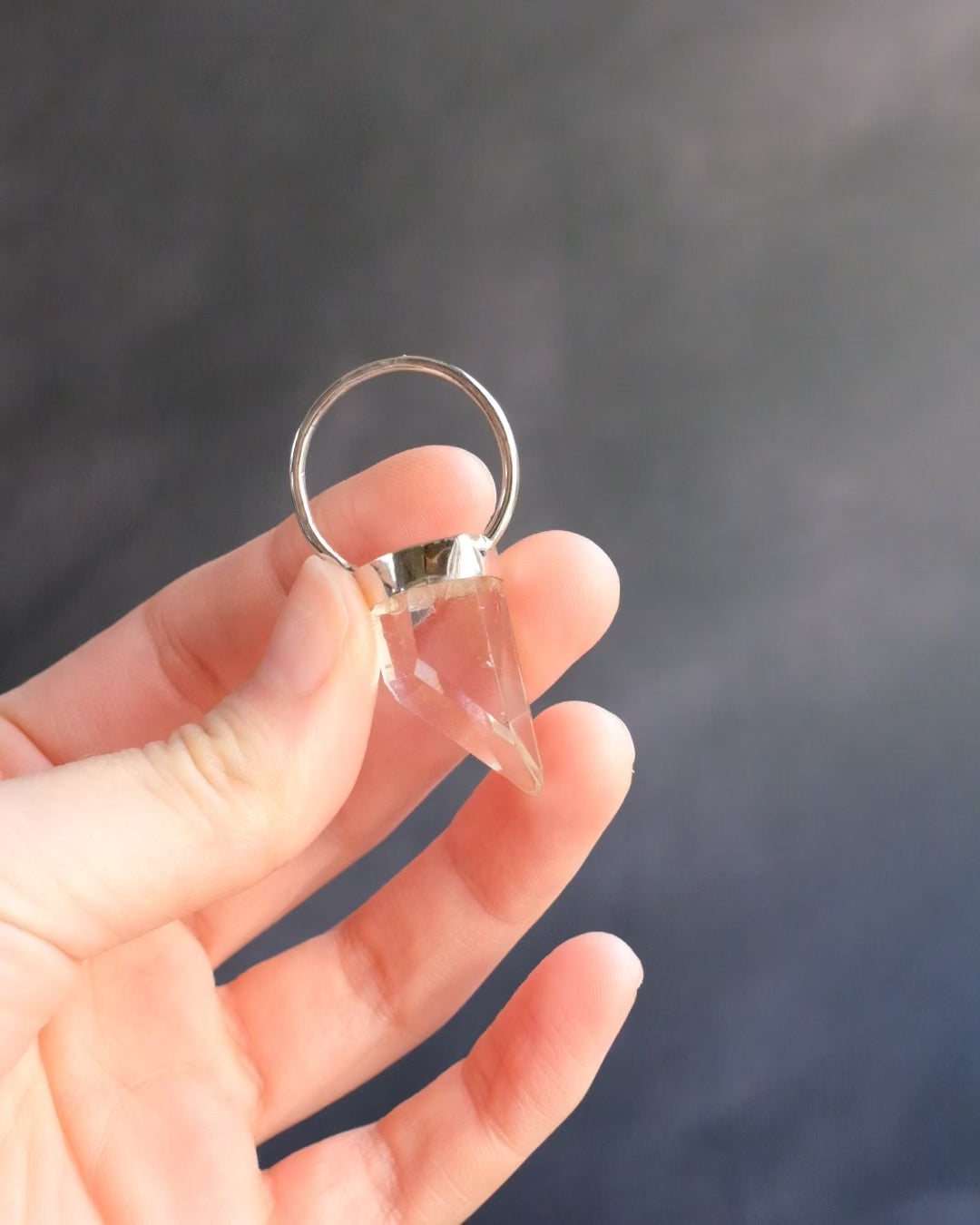 Powerful lemurian clear quartz point set in recycled 925 sterling silver. Polished to a mirror like finish to accentuate the raw materials: silver and quartz. As standard, it comes on an adjustable, cruelty free cotton cord; choose black, brown, or beige. For an additional fee, choose a custom length recycled sterling silver trace chain.