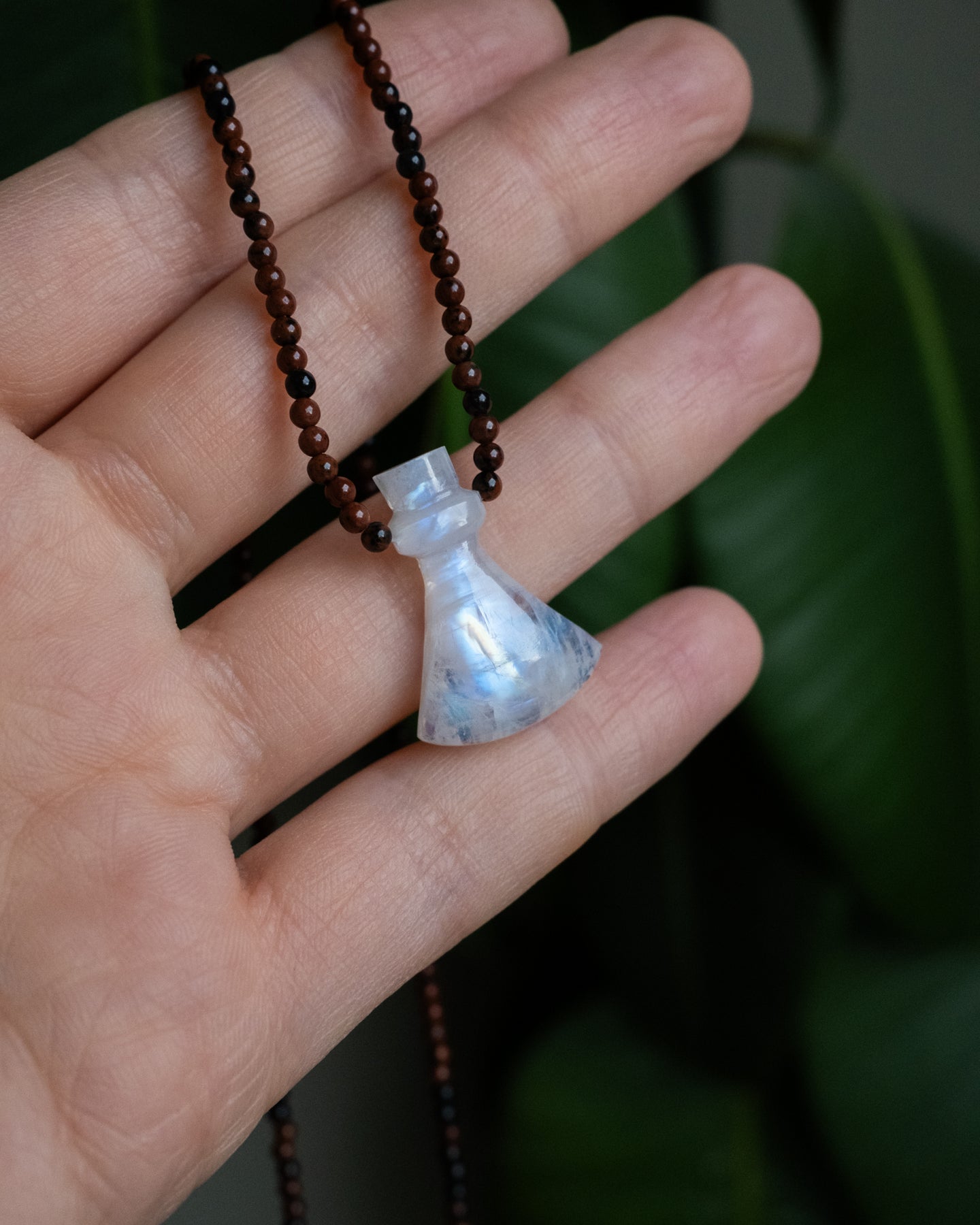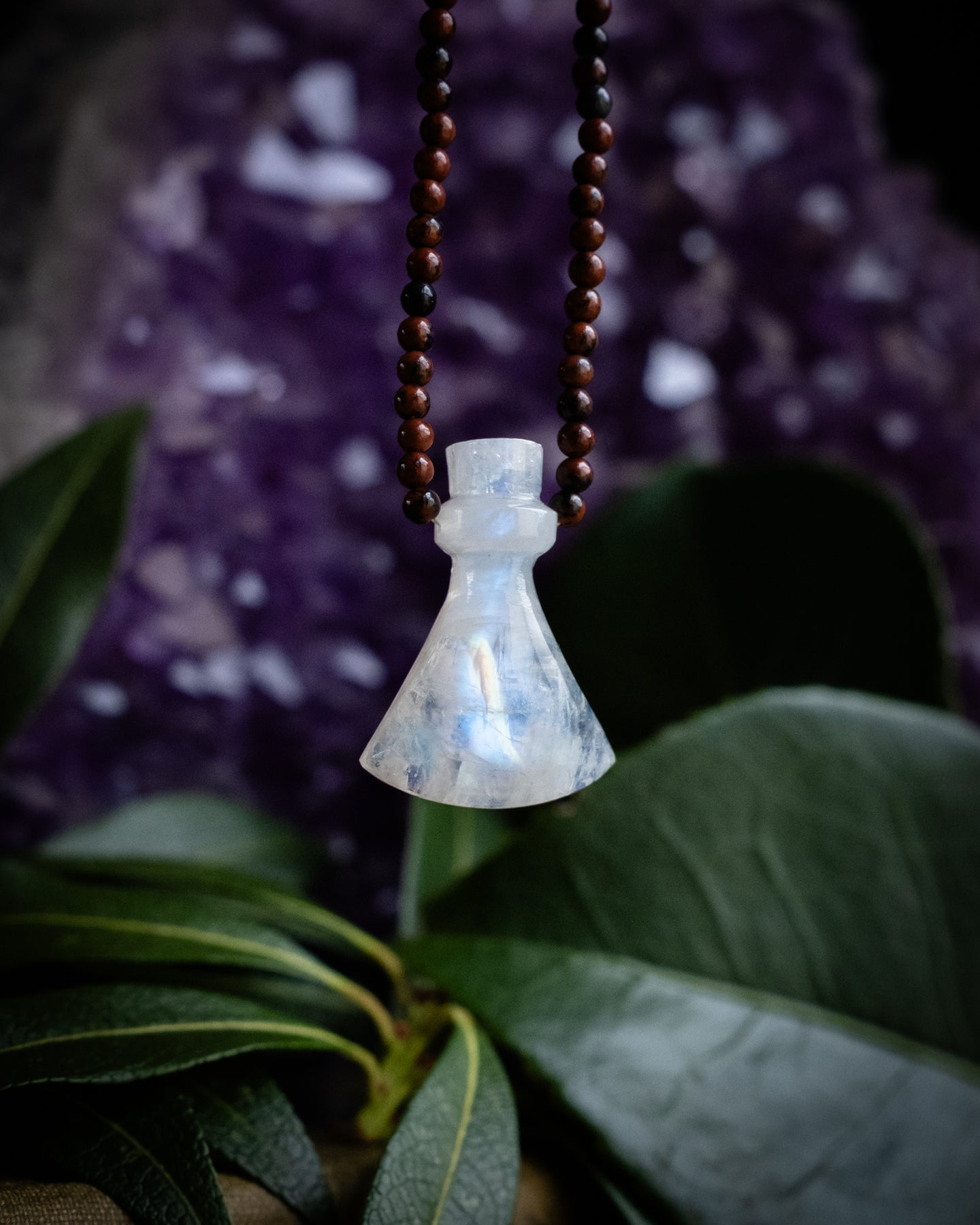 A potent blend of crystal alchemy that you can carry with you always. This piece includes a hand carved rainbow moonstone potion amulet on a string of mahogany obsidian beads, finished with either recycled sterling silver, 14ct gold plated or 9ct gold fastenings.