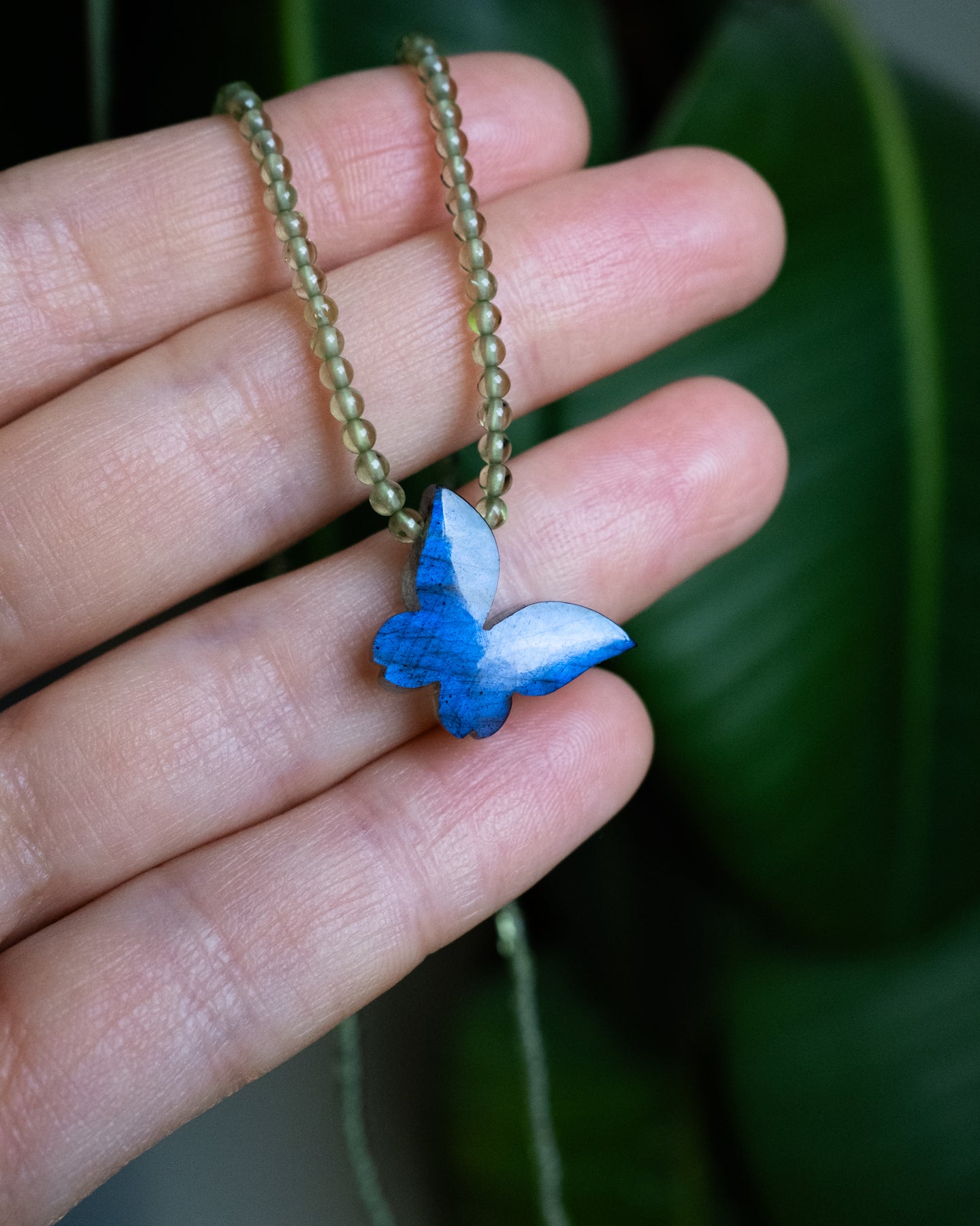 These beaded necklaces feature a hand carved blue labradorite butterfly at the centre, with a fully beaded strand of gemstones. Finished with either recycled sterling silver, 14ct gold plated or 9ct gold fastenings. Length varies, so please read the description below carefully.