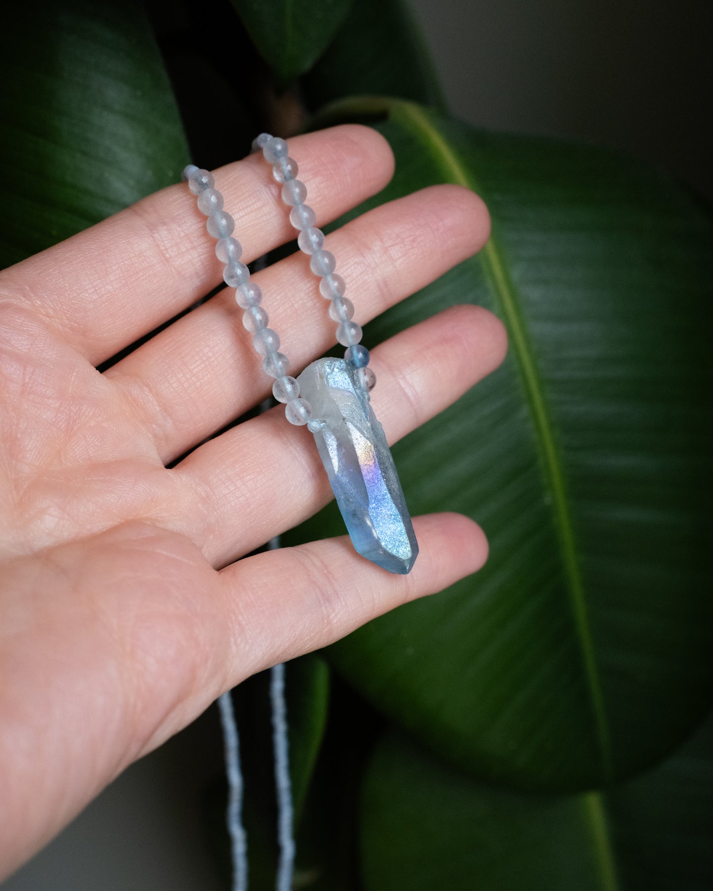 These beaded necklaces feature an ethereal aqua aura quartz point at the centre, with a fully beaded strand of gemstones. Finished with either recycled sterling silver, 14ct gold plated or 9ct gold fastenings. Lengths vary, so please read the description below carefully.