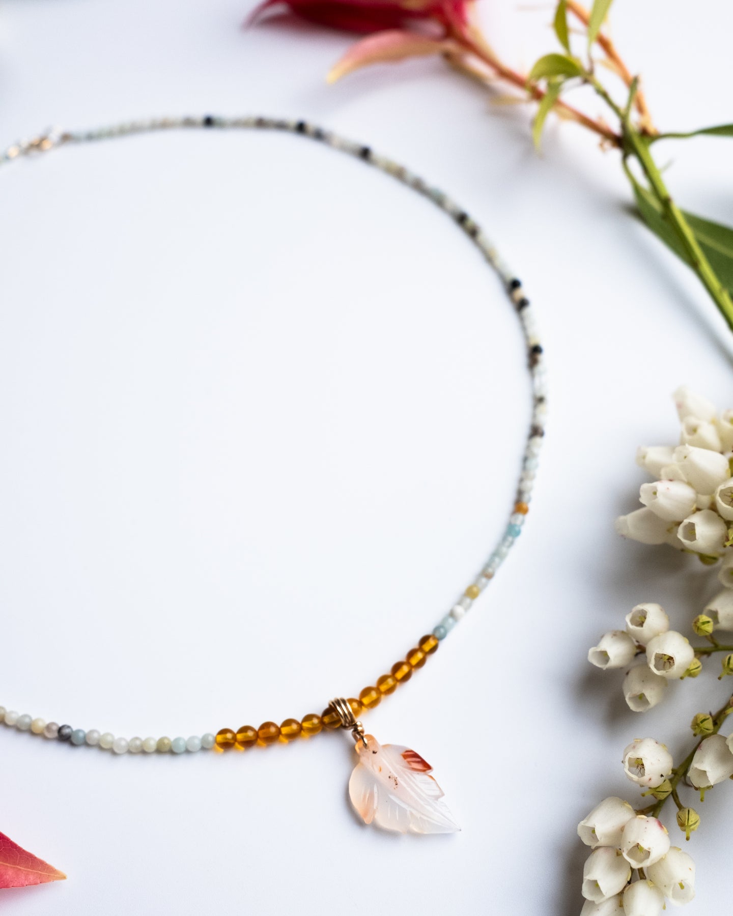This powerful beaded necklace includes a stunning, hand carved carnelian leaf wrapped in recycled 9ct gold and surrounded by amazonite and baltic amber beads.
