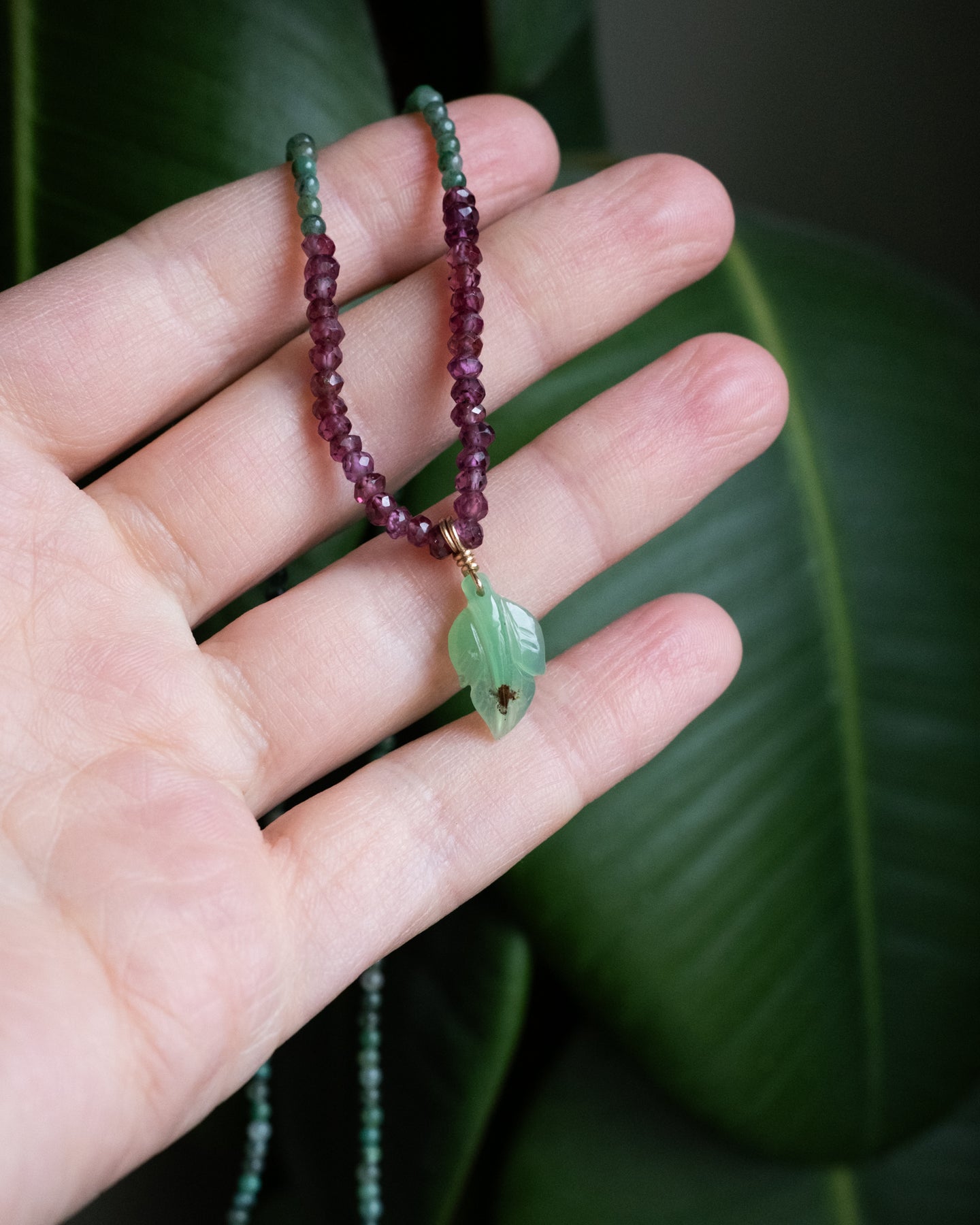 This powerful beaded necklace includes a stunning, hand carved chrysoprase leaf wrapped in recycled 9ct gold on a string of rhodonite, garnet and African jade beads.