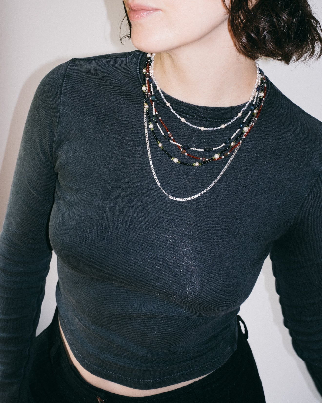 Otherworldly Ethiopian black opal satellite necklace with red garnet and black spinel, finished with 9ct gold fastenings. Looks great layered or worn on its own.