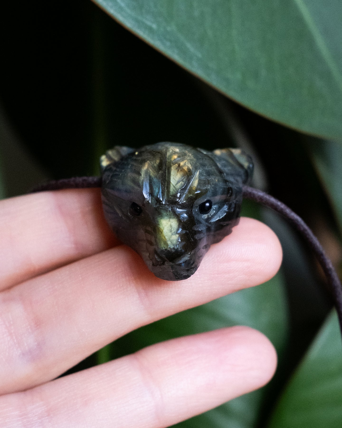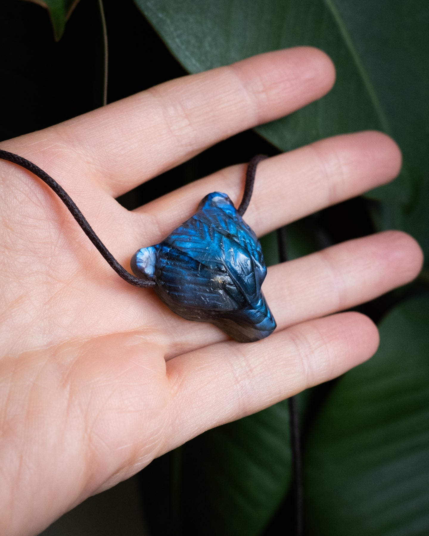 These stunning bears are meticulously hand-carved from shimmering labradorite. Each necklace comes on a cruelty-free cotton cord, available in three colours: black, brown, or beige. Choose between a fixed length with sterling silver fastenings or an adjustable length with slip knots.