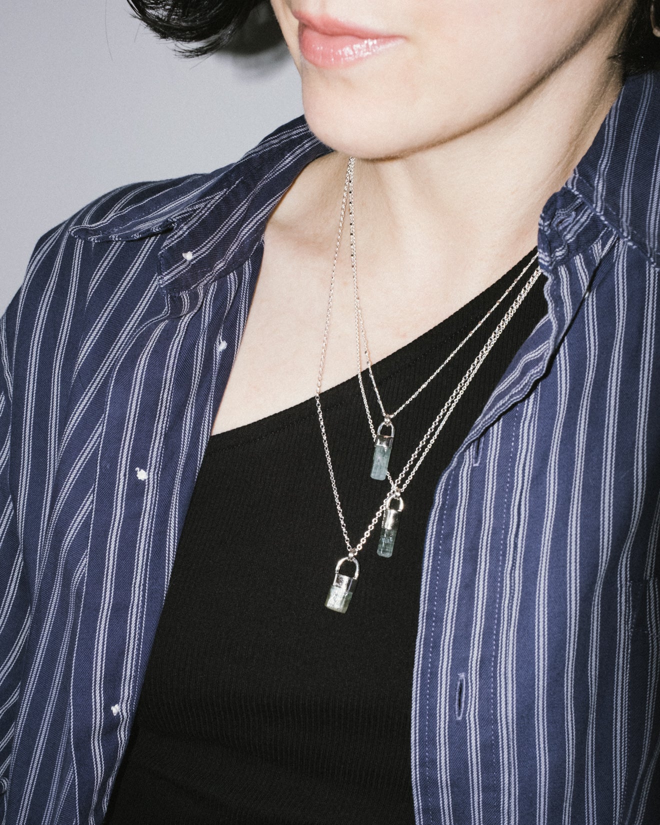 Raw and powerful aquamarine set in recycled 925 sterling silver. Finished with a mirror-like high polish, and hangs on a sterling silver belcher chain.