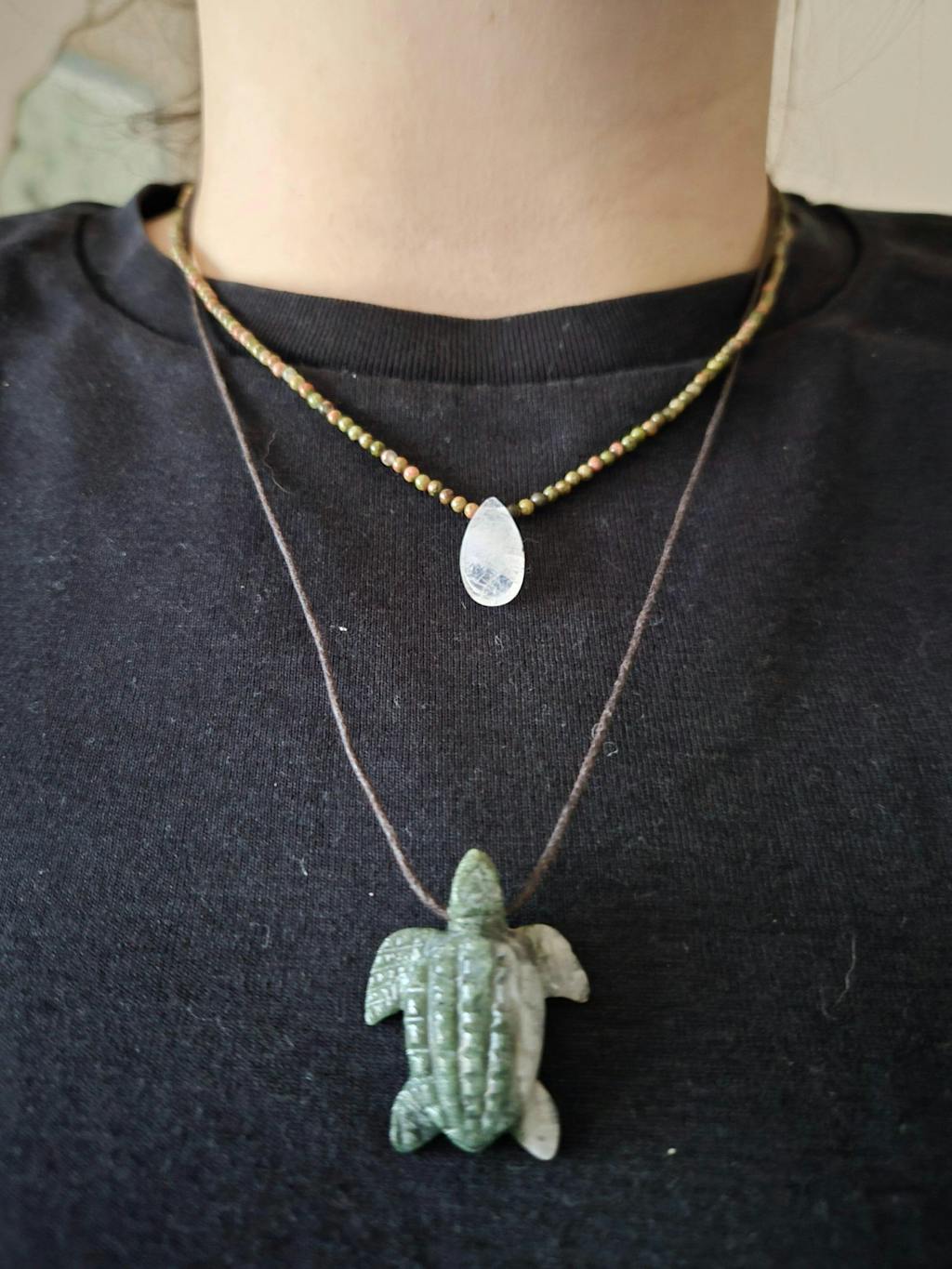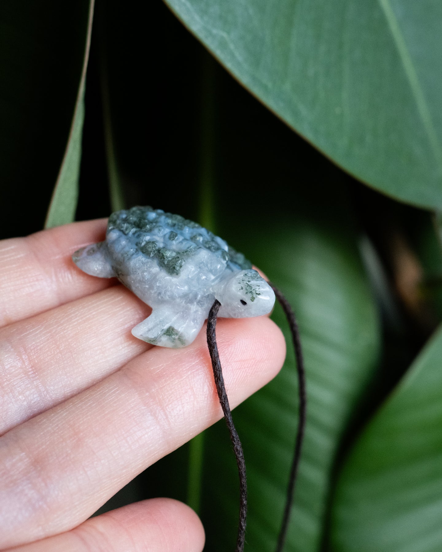 These leatherback sea turtles are so cute! They are hand carved from beautiful moss agate, and include tiny black agate eyes. Each comes on a cruelty free cotton cord; choose black, beige, or brown, with your choice of fixed length finished with sterling silver fastenings, or adjustable length with slip knots.